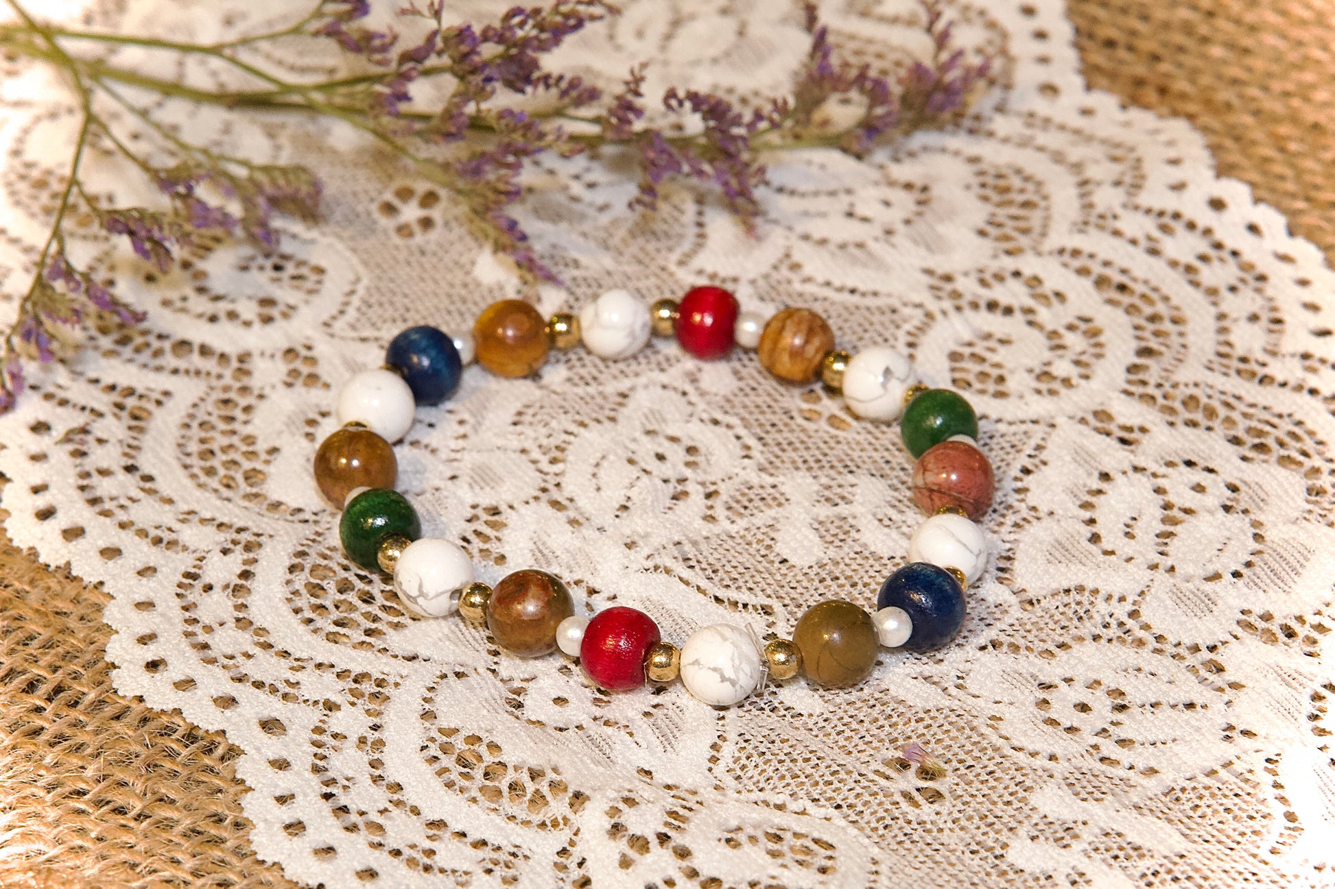 Mélange de couleurs douces et naturelles, rehaussé de petites perles dorées.